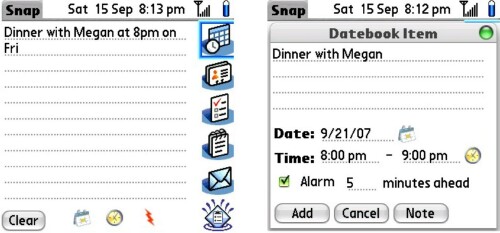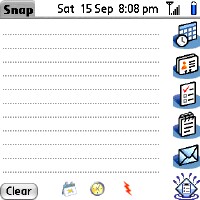 Snap is organized into three basic fields: a text entry memo area, a column of the PIM apps into which the text gets imported, and a bottom row, consisting of a Clear button, date stamp picker, a time stamp picker, and an application shortcut tool for launching frequently used apps.
