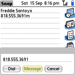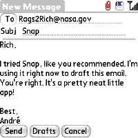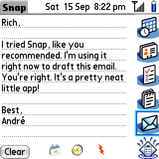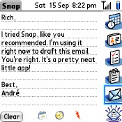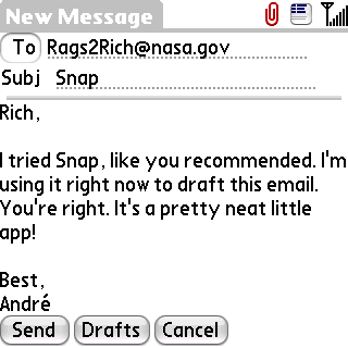 I was surprised by how much I liked using Snaps text field to compose the body of an email before sending it to the mail app. I have no idea why, but writing an email without initially looking for the recipients email address, or navigating to a file attachment, feels more informal and fluid that composing directly inside of a mail client. Actually, thats true for all apps that take input from Snap, which is really the reason for its existence. I wish it did the same for Messaging, since I text message far more than I email from the Treo.