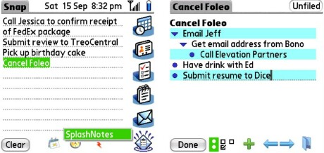 Beyond the vanilla PIM app buttons, theres a button to send selections to a trial version of one of Snaps grown-up cousins, SplashNotes. SplashNotes (formerly ThoughtManager under Hands High) is a robust outliner that I found quite addictive for brainstorming and organizing. As a regular user of Progect Manager, an open source equivalent, I appreciated SplashNotes Zen-of-Palm simplicity, though Progect wins on the sheer number of features (closer to Shadow Plan, but free). Im registering SplashNotes for its integration with Snap, and its superior desktop client. For a more in-depth look, be sure to read Jays TC review.