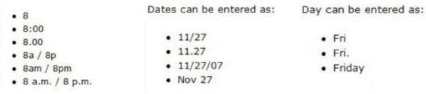 Snap is pretty good at figuring out how to parse a sentence into the proper data fields in Calendar. Writing Dinner with Megan at 8pm on Fri will import Dinner with Megan into a Calendar entry for the upcoming Friday at 8 p.m., dropping out extraneous propositions and conjunctions. Snap will figure out 8 p.m. written as 8 p.m., 8pm, or 8p. Numeral-only hours default to a.m. entries. Snap recognizes the following formats: