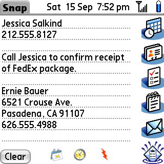 Andre tried out SplashDatas Snap, a quick entry tool for Palm OS handhelds. In brief, it gives you one place to take notes while talking to someone, and then makes it easy to quickly turns those notes into appointments, contacts, tasks and more. Andre remarked: