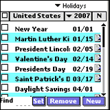 - Holiday Dates from 2006 to 2015.. - 70 Countries & 1100 holidays.- Can add new Category/Holiday/Event to the existing collection.- Exports holiday in Datebook/Calendar without going out of the MobileDates application.- Sort/View based on year/category.- Export to Memopad. Get all the dates you always wanted to know in advance on your Handheld. Upcoming holidays sorted in order of region and religion. With this you can also add new events like Birthday, Anniversary etc. So now you don''t miss any dates!