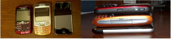 Speaking of looks, let's start with the size of the Curve. As you'll recall in my first article, the Curve was the 2nd thinnest device compared to the Treo 680 and the iPhone, with the Treo 680 being the biggest. You can certainly see in the pics that the Curve is the shortest of the three devices. The Curve is also the lightest.