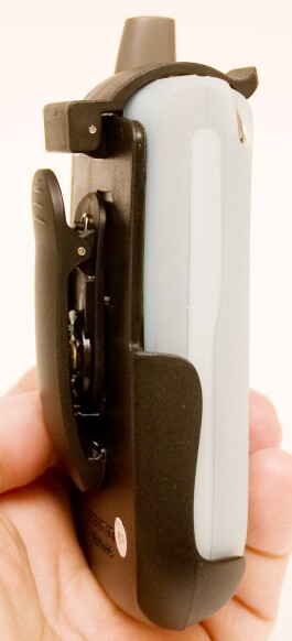 To use the holster, assuming your skin case is already on the phone, seat the Treo in the bottom prongs of the holster and tilt it up into the jaw of the top clasp. The Treo goes in face first, so the screen faces inward, protecting it from the cold cruel world. This is important, because skin cases offer cutouts for the screen, leaving it open to potential hazards.