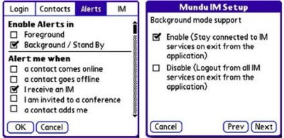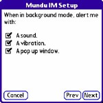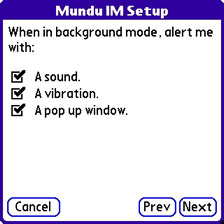 You also have the opportunity to enable alerts. If you desire, Mundu can emulate a fire truck with annoying sounds, rumbling vibrations and pop-up alerts every time you get an instant message, though after a while you'll likely get quite sick of all the noise. I chose to have my Treo vibrate, as of all the choices it is the least intrusive from those I could select.