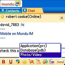 File-sending via Mundu on a Treo uploads the file to Mundus servers and then sends a familiar-looking "http://" hyperlink in the IM window that your buddy can just tap to download or view the file. You can send any photo, video, PRC (program) or PDB (database) file in this manner, which works with any messaging client, as it does not need to follow any special peer-to-peer protocol. This means that if your friend is running Trillian, AIM, iChat, etc., they never have to worry about compatibility with Mundu. Its file transfer method just works with everything.