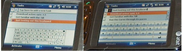The Tilt is sort of lacking when it comes to the "out of the box" experience. As I said in my first Tilt article, the slide out keyboard is nice and has a certain "coolness factor". It just has a kind of James Bond flair the way the keyboard is hidden away. But it's also sort of annoying to have to slide the keyboard out each time I want to type something. The Tilt does have an onscreen keyboard but it's really small, so you might as well get your stylus out unless you have tiny fingers. I have small hands but even my fingers were too large to type out words on the keyboard. I had mentioned my annoyance with the sliding out the keyboard when needing to type over at the Round Robin thread and forum member starrwulfe kindly recommended PocketCM Keyboard. I downloaded it and was happy with how well it looked and worked. It's bigger than the onscreen keyboard that comes on the Tilt. I could actually use my fingers to type.