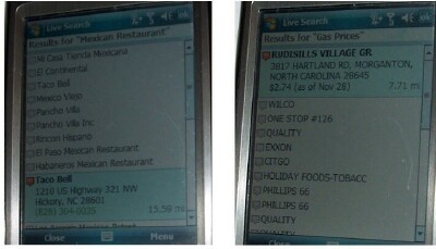 Another cool app that I liked was Live Search, which I downloaded OTA. You can use your voice with Live Search also. You can say the name of a store in your area, see what movies are playing, check for the lowest gas prices, or look up different types of restaurants. For example you can ask for Mexican or Italian, etc. I think the program had a hard time understanding my thick Southern accent because I had to repeat myself several times. I especially like the Gas Price search since gas is soooo sky high nowadays. The cheapest gas price I saw in my search was $2.46 in Houston, Texas, and the highest was $3.36 in Seattle, Washington. The cheapest gas in my area was $2.74 in Morganton, NC.