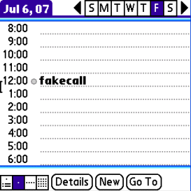 There are two ways to tell FC to make sound - manually, by flipping the Treo's top ring / mute rocker switch back and forth once, which you can do pretty inconspicuously while your Treo's in your pocket, or by creating a calendar event (or Agendus Meeting) with FakeCall as the event name. In the latter case, just set the time, not an alarm, as the alarm would be redundant when FC causes your Treo light up like a Christmas tree. It might also be a dead giveaway to have a system alert pop up with "FakeCall" as its description when your mock conversation initializes.