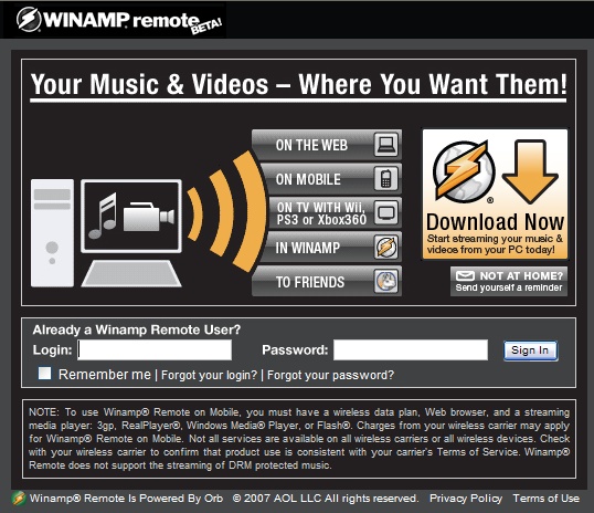 Winamp Remote is actually a modified, customized version of Orb in disguise. What it's gonna do is turn your computer into your own private media server.