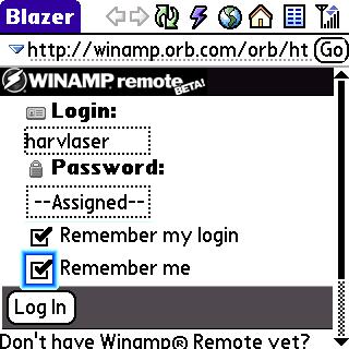 Start WR running on your PC, and then grab your Treo, load Blazer and send it to http://winamp.orb.com . You'll have to sign in with your new WR user name and password the first time.