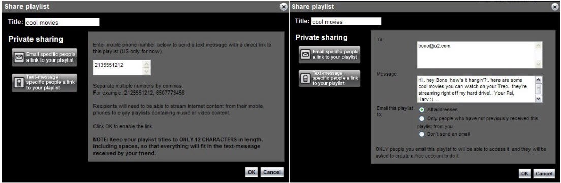 Send WR Beta off to its full-sized Web site and here you can do all kinds of things, like create playlists of your computer's audio and video files, and SHARE them with anyone else who has a Treo, by sending a link via an SMS message, or anyone who has a computer, by sending a share to their email address. Or share a single file, a group of files, or selectively-chosen files. Your friends get a share link to ONLY those files you permit them to hear or watch, and you can cancel or modify a share any time you please.