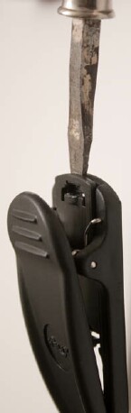 After you open its jaw with a flat-bladed screwdriver, slip the clip over the button and close its jaw, and its not going anywhere without your approval. You dont need the screwdriver to close it, but once it snaps shut it stays closed till you drag out the screwdriver (or whatever else) to remove it.