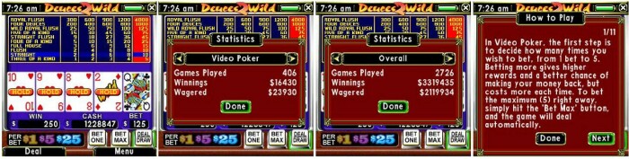 AC's VP machine features the two most common variants: straight Jacks or Better, and Deuces Wild. Unlike slots' mindless button pushing, you have to use your brain in VP. The beautifully rendered screen looks exactly like the real deal. I'd like to see Astraware expand the machine with some of the other variants of the game, such as Joker's Wild, Bonus, Double Bonus, and (my favorite) Double Double Bonus VP.