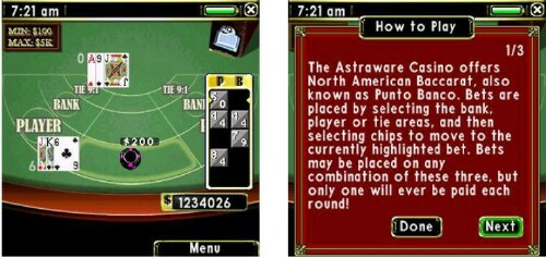 Astraware has packed as much of the real-life casino gaming experience into this package as they could possibly get, even in a 2mb program. Missing are such things as restaurants, bars, gift shops, stage shows, cocktail waitresses, valet parking, and a hotel room to crash in. Hey, you want miracles in 2mb? {{grin}}..