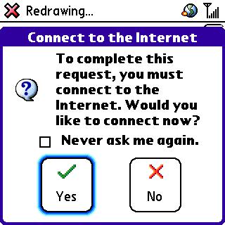 Id tap the YES button, and watch as it tried to make a connection to Sprints EVDO network and fail. The little graphic of two hands shaking never appeared. Id try to cancel out of that, which often took a minute while the Treo sat there playing with itself. Id try it again, same thing. No connection. ONLY rebooting the phone would fix this ugly situation.