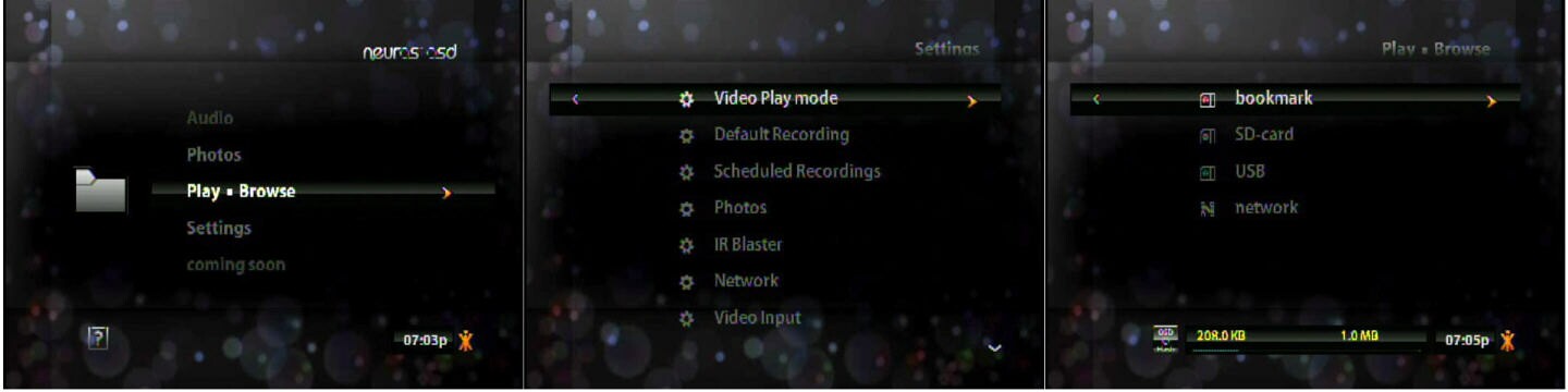 remote's "?" button brings up context-sensitive help windows. On any screen with an orange symbol Neuros calls "Xi" (say "Zye".. which is short for eXtra information, punch the Xi key on the remote for a context-sensitive, scrolling list of actions you can take, depending where in the interface you are, or during recording and playback, such as deleting and renaming files and timers, copying files from one Storage device to another, and many other functions.