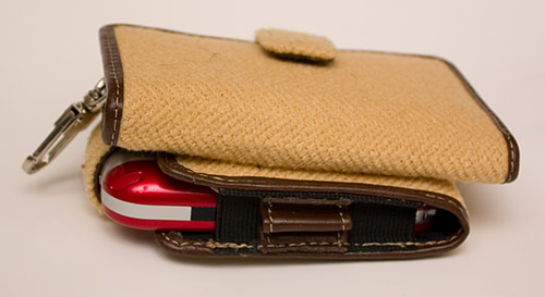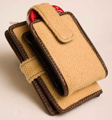CellKeeper keeps your phone reasonably protected, while offering handy wallet style storage for other stuff you might need. The case and its contents totes in a pocket or purse or swings from a shoulder and adorns your person. Its a well designed, well made, good looking case of herringbone cotton and manmade materials. It fits all of the Palm models, but works best for the smaller devices, like my crimson Treo 680 and my (red!) Centro.