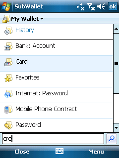 Its unique Quick Search Bar available at the bottom of the main view allows you to quickly find any data entry by typing just a few letters. Almost instantly Subsembly Wallet Mobile presents you with a list of all records that contain the entered text fragment.