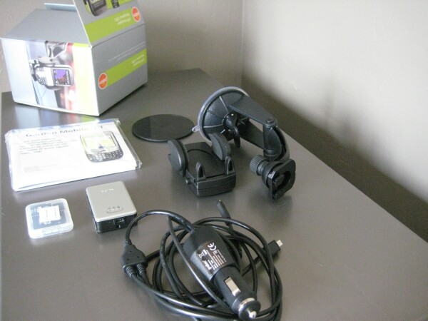 The kits other main component is the microSD card containing Garmins Mobile XT software installer and maps from NAVTEQ, covering the US, Canada and Puerto Rico. Palm has included SD and miniSD adapters as well, making the product compatible with all Treos and CentrosPalm OS and Windows Mobile. The software installs to the phones internal memory, but the maps are not transferable, unlike TomToms CD-based content.