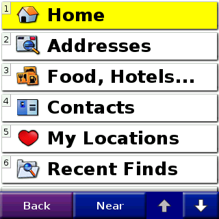 In regular use, Where to? transfers the interface to a menu of ten search options in large type for easy viewing a distance: