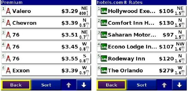 Within Food & Drink, for example, you can filter local restaurants by type or genre (e.g., Mexican, Asian, Deli/Bakery, Café/Diner, etc.). Two of the most interesting categories are Lodging and Fuel, which allow for price comparisons. For instance, in addition to lodging categories (Hotel/Motel, Bed and Breakfast, Campground/RV Park), you can select hotels.com Rates to view a list of local accommodations and their prices, updated live from Garmin Online with data from Hotels.com. Similarly, you can select the Fuel Prices submenu in Fuel for an updated list of local gas stations with their prices. Other goodies from Garmin Online (free subscription) are traffic and weather updates.