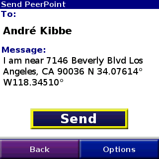 PeerPoints allows you to send your current location as a text message, which can come in handy. The message format is: I am near [address] [map coordinates] Instead of coordinates, I would have preferred it to send the nearest cross street.