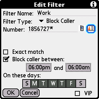 You can also set up wildcards to block numbers, which work very well. You can set up a filter that blocks all those annoying (888) numbers by entering 1888*. If people from Delaware, for instance, really get on your nerves, you can set a filter for 1302* and block all callers from the (302) area code.