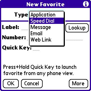 Regardless of which carrier you got your Centro from, the Favorites feature has lots more power than just dialing a phone number. That little chooser dropdown will give you a clue to what I mean. You can, for example, run an application, or invoke Email. The Web Link item lets you enter a complete URL and instantly browse to it when you invoke the Favorite. I use it to get weather reports quickly when Im running around town have to know if thunderstorms are threatening, so I can zoom home and unplug my computers.