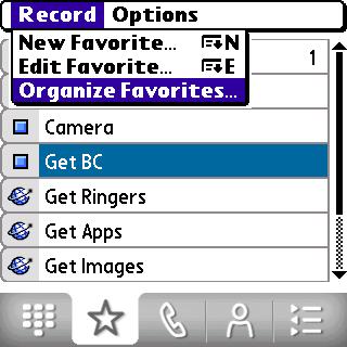 This is the tab with the star on it. It lists favorites and quick dial options. You can add, delete (thank you, Palm!) or edit the favorites list, and change the order in which they appear. Fresh out of the box, your Centro comes with a collection of Favorites to get you started. That is, get you started buying stuff from the carrier. Feel free to replace them with something you can actually use.