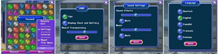 Once installed, you can also fine-tune the in-game settings to your liking. From the settings menu, you can set the general game settings to display tips, to display clock and battery level and set the board transparency. You can also change the sound settings such as the volume of the sound effects and music or choose to mute one or the other, or both. You can even set the screensaver settings to 'none', 'demo', 'slideshow' and allow sound or mute it altogether. For those who prefer a language other than English, players may choose from 4 other languages - German, Spanish, French or Italian. Very nice customization possibilities!