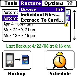 In fact, the way it is implemented outdoes some of its competitors. After a hard crash or reset, you simply insert your memory card with BackupMan.prc, launch it straight from the card, and a simple little box pops up and says Hey! Your device looks like it got wiped! Wanna put it back the way it was? Okay, Im paraphrasing. But you get the gist. It really does restore everything in one tap.