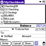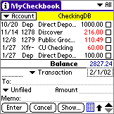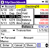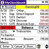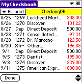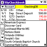 MyCheckbook is a neat little checkbook app that takes up very little memory on your Palm OS Treo or Centro (172KB), is simple to use, and will let you leave your checkbook register at home. In fact, I don't use a regular checkbook register anymore. MyCheckbook lets me create multiple accounts, classify the type of transaction (i.e., Deposit, ATM, Swiped, etc.), and even note the items that have cleared by placing a "check" in a box next to each item. I can edit, void and delete items as necessary, all the time keeping a running balance in my account.
