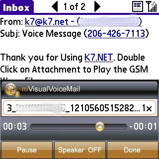 K7.net (the free voice mail to email service that I was using) must not be compatible in this regard because all of the messages that mVVM downloaded were displayed as from an Unknown Caller and an Unknown Number. This would have been a convenient feature to use and if this is important to you, make sure to try it ahead of time to ensure compatibility. Interestingly enough, the times that displayed next to the messages were also incorrect as well. I'm not sure if this was another incompatibility with K7.net and mVisualVoiceMail or just a fluke, but a quick check in my email showed all times correct there. Again, your mileage may vary, just be sure to try the free demo