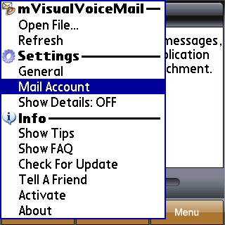 If you choose to use your default email client, you have to go to your email program (Versamail, Chatter, etc.) where you receive your voice messages emailed to you and click on the attachment. Once the attachment loads, mVisualVoiceMail takes over as the message player and your voice mail is played. Choosing to use the software in this capacity is fine, however, you will be foregoing some of its strongest points. So, for even more voice mail fun, let's allow mVisualVoiceMail to download the messages.