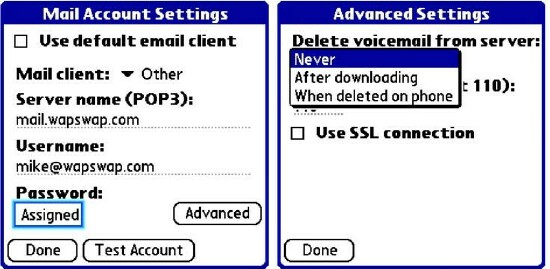 Once you've got the software installed (you can download it OTA from TC's software store directly to your Treo or Centro) the first thing that you'll be presented with is a short Setup Wizard. When I say short, I mean it, it's only one screen long (two if you count the advanced settings). Here is where you need to decide whether or not you will use your default email client or allow mVisualVoiceMail to handle the voice messages. The difference in these setups are pretty straightforward (once I figured out that if you opt to use your default email client, the messages never show up like the pretty screen shot that MotionApps shows) so here's how it works...