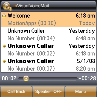 Once you have your messages downloaded, you can - you guessed it! - play them all from the interface. Using the 5-way to navigate to the desired message, a simple click on the center button starts the playback, with the speaker toggled on and off with the space bar. Pressing the center button again pauses the playback, and using the right and left on the 5-way works like a DVR. One thing that would have been nice to see here - if MotionApps had found a way to integrate that all-but-useless green send button. Though there is a simple call back button on the screen, you have to actually touch the screen to utilize it - Oh the humanity! They could have saved me at least an half an inch worth of energy.