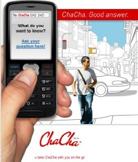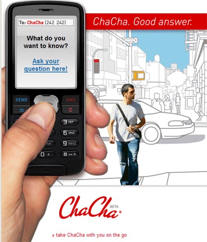 ChaCha (800-2CHACHA): Ask ChaCha a question about anything, and you get the answer, including a link to the Web page where the services actual people found the information. You can also ask your question by visiting the web page and typing into the phone screen pictured on the left.