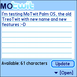 Since Palm OS Treos have threaded SMS natively, it's well suited for Twitter without a special client. But if you don't have unlimited text messaging, you can download MoTwit, which works through Twitter's mobile site. I prefer threaded SMS to the latency of the mobile site, but it's great to have both options.