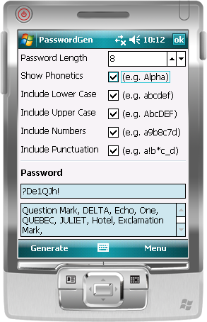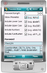 Pocket PasswordGen (June 7) is a great little app for generating passwords. This is particularly helpful if you are required to change your password frequently. Lots of folks work for companies that require very frequent password changes and, in my case, I often suffer from UPCS (Unique Password Creativity Stupor). This app removes the pain of trying to figure out an acceptable password -- merely select the required criteria from the list (i.e., lower case, numbers, punctuation), and PasswordGen will deliver!