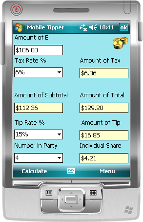 Mobile Tipper (June 10) allows for entry of the bill amount, tax rate, desired tip rate, and number in your party. Given the information you input, Mobile Tipper will then calculate the subtotal and total (with tax), the amount you should pay for the tip (based on the tip rate %), and each individual's share if more than one party is paying the bill.