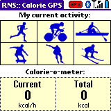 Calorie GPS, by RNS::, is the first caloric consumption calculator for Palm OS that provides fairly accurate statistics based on the GPS readings and a few user-defined factors. The GPS readings include distance travelled, current velocity, acceleration changes, and can also include altitude changes. The factors include body weight, terrain characteristics, and activity type: