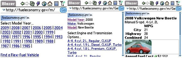 Of course I was curious about this mobile website so I checked it out on my Centro. I drive a 2000 VW Beetle and it gets pretty good gas mileage, which is important especially now with gas prices through the roof. The last time I filled up my car, it cost me $50 and I was thinking, "You've GOT to be kidding!" I'd hate to own a large gas guzzler if my little VW costs that much to drive.