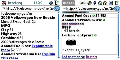 I also saw what the annual fuel cost is. The EPA mobile site has the 2000 VW Beetle having an annual fuel cost of $2,552. Adn the annual amount of petroleum use is listed as 14.3 barrels. And my car's carbon footprint is 7.7 tons CO-2 a year. That's a lot for a small car!