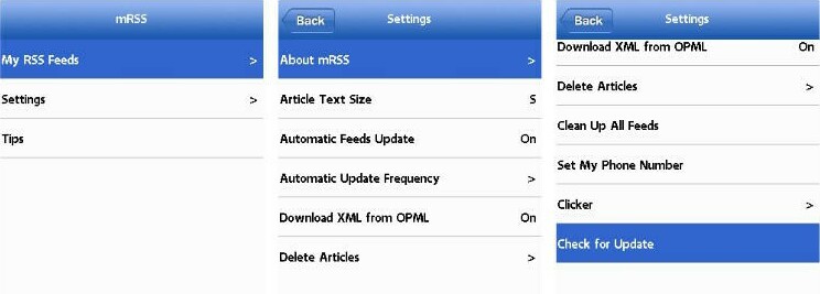"Settings" allows you to change the article text size from small ("S") to XXL. You can set mRSS to update your feeds automatically and adjust the frequency of the automated updates as well. You can also delete articles in this area and adjust the 'Clicker' volume.