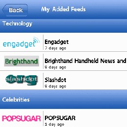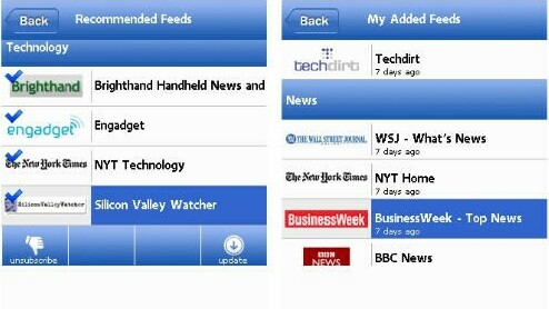 "My RSS Feeds" is the real meat in this application. It is here that you can access the list of your added feeds, view your archive, and add new RSS feeds to your list. Adding RSS feeds can be done in a few ways. First, you can add a feed manually (if you have a little know-how; many sites have an RSS icon in the address bar and, once clicked, will provide you the RSS feed web address), add from your PC, or add from a recommended list that the kind developers at MotionApps have provided for ease of use. Adding from your PC is intriguing because this allows you to surf, search and find RSS feeds on your desktop computer and then import these feeds to your Centro or Treo via mRSS. For the sake of simplicity, I chose the easiest option: adding from the recommended list. This is a great way to get started with using RSS feeds and there are many different feeds spread among several categories to choose from: anything from Cars, Celebrities, Finance, Food, Fun, Geeky (has my name all over this one), News, Technology, Science, and Sports. Once you are browsing among the recommended feeds, you can just tap "Subscribe" or select with your middle button on the 5-way. Also, you can hit the "Update" button to update the list of recommended feeds if new ones have been added.