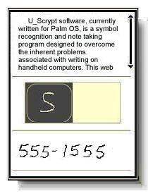 U_Scrypt, currently developed for Palm OS, is primarily a specialized writing system and symbol-recognition program designed to overcome the inherent problems associated with writing on handheld computers. It is experimental in the sense that it is new and was devised to compete head-to-head with pen on paper note-taking which is not yet possible given the devices on the market today (mid 2008).