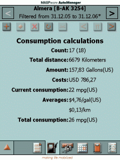 MASPware AutoManager turns the Pocket PC into a professional administration tool for all kinds of vehicles. Starting at the important calculation of consumption (l/100km, km/l and MPG) up to full cost- and appointment administration, including a travel book for business and private travels. Furthermore, there is a checklist added for every vehicle (for using it as a To-Do-List for example).Finally, there are several evaluations possible as well as exports.