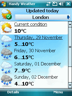 Note: To get weather forecast you should have enabled Internet connection. Handy Weather supports different Internet connections: GPRS, Wi-Fi or Internet connection from your Desktop computer with help of ActiveSync program.