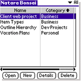 Natara Bonsai is a full featured Palm OS outliner with FULL one step synchronization to a companion Windows desktop application! Use it to outline ideas, as a hierarchal to do list, a simple project manager, or ALL in the same outline. Stay connected with the Natara Bonsai outliner, a Palm OS outliner that was "Born to Sync".